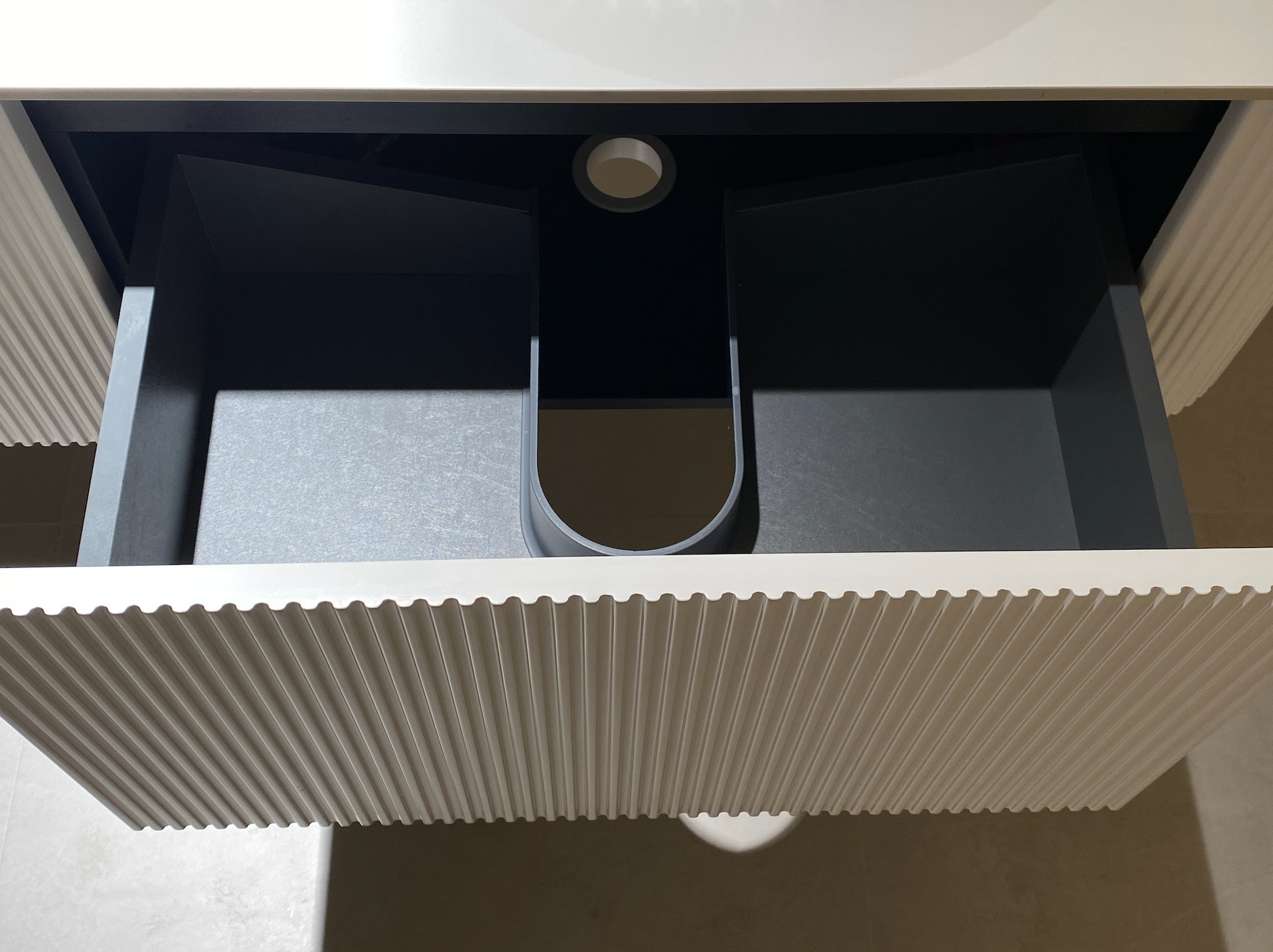 Our wall mounted Bella vanity, distinguished by its fluted design and exquisite curved edges. The design has a neat configuration of drawers to provide a multitude of storage options. It is constructed from high density moisture resistant particle board for durability assurance and comes with the convenience of ultra-soft closing drawers.